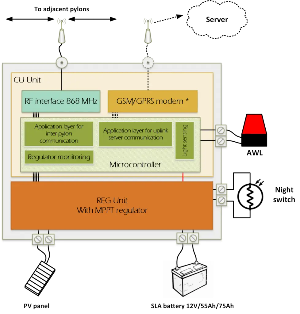 Řešení je tvořeno autonomními monitorovacími uzly umístěnými přímo na jednotlivých stožárech. Každý uzel se skládá z řídicí komunikační jednotky (CU) a napájecího regulačního modulu (REG), které byly kompletně navrženy ve vlastním vývoji – od schémat a návrhu DPS až po embedded firmware. Řídicí jednotka zajišťuje dohled nad stavem LVO, sběr diagnostických dat a jejich přenos do nadřazeného systému.